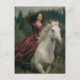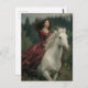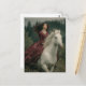 Una mujer monta un hermoso caballo gris con un vestido burganeso