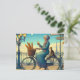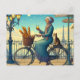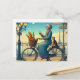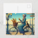 Postal Una mujer montando un gato de bicicleta