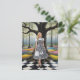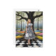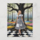 AI generó a una mujer rubia con un vestido de cuadros negros y blancos en un piso de cuadros negros y blancos en un colorido y mágico bosque de tableros de ajedrez
