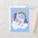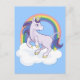 Ilustracion lindo de un unicornio mágico púrpura parado bajo una nube criando bajo un arcoiris. Un diseño dulce y femenino para las niñas, o a cualquiera a quien le gusten las cosas un poco lindas.