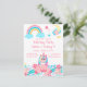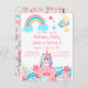 Esta invitación de cumpleaños femenina y linda es perfecta para tu niña. Cuenta con ilustraciones adorables dibujadas a mano que incluyen un unicornio sentado en un lecho de flores, un arcoíris colorido en el cielo, estrellas fugaces y una luna con nubes sobre un fondo blanco. En la parte posterior hay un patrón de todos los componentes sobre un fondo rosa suave. La paleta de colores incluye amarillo, verde turquesa, azul brillante, rosa, púrpura y naranja. Es una invitación de cumpleaños adorable, dulce, moderna y mágica llena de elementos míticos, juguetones y divertidos. Los colores de fondo y toda la información, incluida la edad, se pueden cambiar en las opciones de personalización.
