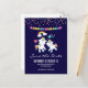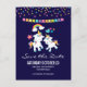 Tarjeta postal de fiesta de fecha para guardar con 2 unicornios bailarines lindos con colas y crines brillantes y coloridas. Un arcoíris colorido con nubes a cada lado sobre sus cabezas. Otros elementos incluyen una pequeña flor, un corazón y algunas estrellas. Fondo morado oscuro. Imagen de puntos de confeti coloridos y una bandera de banderines a lo largo de la parte superior.