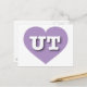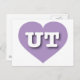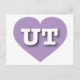 Esta postal presenta un corazón de lavanda suavizado que contiene las letras en negrita y blanca del funda superior UT, la abreviatura oficial de Utah, el estado de la colmena. El lado inverso de la postal está en blanco, esperando tus sentimientos escritos a mano o texto personalizado. Elija el estilo de fuente, el tamaño y el color.