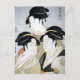 Disfrute de esta hermosa reproducción de la impresión de 1793 en bloques de madera "Three Beauties" del artista japonés Kitagawa Utamaro. Esta imagen representa a tres mujeres de Edo (ahora Tokio) famosas por su belleza. Ukiyo-e ("imágenes del mundo flotante") es un género de estampados japoneses en madera (o cortes de madera) y cuadros producidos entre los siglos XVII y XX, con motivos de paisajes, cuentos de la historia, el teatro y barrios de placer. Es el principal género artístico de la impresión en bloques de madera en Japón. La tienda Floating World de Zazzle restaura minuciosamente estos tesoros históricos a sus verdaderos colores y arregla los problemas básicos del envejecimiento. La textura de papel y el color se mantienen porque revela la belleza envejecida de estas obras maestras del arte.