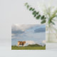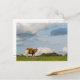 Postal de una vaca rubia de Aquitania mirando hacia el espectador bajo unas nubes en un prado en la región de Dordoña en Francia.