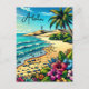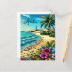 Aloha de nuestra postal de vacaciones. litoral costero tropical bonito. agua azul bonito, palmeras, flores tropicales y un faro al fondo. Ai arte hecho en un estilo de arte pop de historietas.