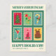 Esta tarjeta de vacaciones para Navidades incluye sellos retro para Navidades con copas, un árbol de Navidad, caña de caramelo, vino e imágenes de pastel de reno, y texto de tipografía retro "Feliz Navidad" y "Felices Fiestas". Personalízalo con tu nombre y año.