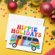 Vacaciones hippie en tipografía atractiva y retro de los años 70 y colores divertidos sobre una furgoneta vintage con flores y signos de paz. Esta tarjeta postal de Navidades hippies, colorida y colorida, es un gran retroceso a los años setenta.