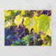 Las hojas de uva iluminadas con luz solar y los tendrils delicadamente curvados hacen una imagen llamativa contra una paleta de fondo azul, púrpura, rosa y verde.