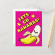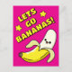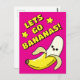 Postal adorable, con un lindo personalizado, un alegre plátano amarillo kawaii con las sonrisas más dulces, ojos grandes redondos y medio pelado. Encima de él con letras amarillas con una sombra negra que dice "¡Vamos Bananas!" Dos brillantes estrellas amarillas son de ambos lados de las palabras.
