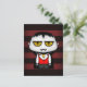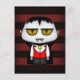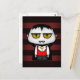 Pequeño personalizado bebé vampiro con grandes ojos de gato amarillo, vestido con un chaleco rojo y una capa negra.