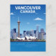 Celebrate the beautiful Pacific Northwest with this clean, vintage-style travel postcard featuring the iconic Vancouver, Canada skyline. The artwork highlights major landmarks like the Harbour Centre (with its prominent tower) and the distinctive sails of the Canada Place convention center, all set against a bright blue sky and the city's waterfront. This design is perfect for Canadian travel enthusiasts, fans of modern cityscapes, retro travel posters, or anyone who loves the vibrant energy of British Columbia.