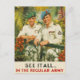 Este vibrante y vintage poster de reclutamiento del Ejército Británico presenta a dos soldados sonrientes con uniformes tropicales blancos con boinas coloridas y cintas de medalla, parados en un exótico entorno. El audaz eslogan "See It All... In the Regular Army" ("Véalo todo... en el ejército regular") resalta la aventura y las oportunidades de viaje del servicio militar. Una pieza clásica de arte de reclutamiento de mediados del siglo XX, perfecta para coleccionistas de afiches vintage, recuerdos militares y decoración patriótica.