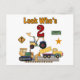 A los niños que les encanta la construcción y los camiones grandes les encantará este diseño de vehículos de construcción de 2º cumpleaños con camisetas de 2º cumpleaños, lianas, bolsas de té, botones de cumpleaños y otros artículos que dicen "¡Mira quién tiene 2!".