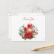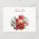 Tarjeta de agradecimiento con un bonito ramo hecho con acuarelas. Velas rojas con acentos dorados y una vela blanca más pequeña también. Rodeado por un ramo de pino con una flor de poinsettia.