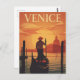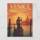 Un romántico afiche de viajes de estilo vintage que capta un momento tranquilo en Venecia, Italia. El ilustracion muestra un góndolo dirigiendo su barco por el Gran Canal al atardecer. El clásico paisaje veneciano, incluyendo la icónica cúpula de Santa Maria della Salute, se encuentra en medio de un cielo cálido y naranja y del sol brillante. Este diseño retro es perfecto para los amantes de los destinos románticos, de la cultura italiana y del arte de viajes clásico, evoca una elegancia atemporal y hace de la decoración una hermosa pieza.