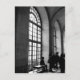 Foto en blanco y negro de un hombre sentado en una silueta de banco frente a una enorme ventana abovedada.