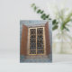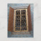 Una ventana de madera con postigos, decorada con un grill ornamentado y baldosas azules y blancas alrededor.