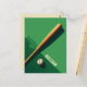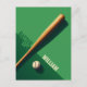 El tema de esta postal incluye el ilustracion de un bate de béisbol y una bola colocada en un fondo verde de dos sombras con el texto "¡golpear!" con un nombre de personalizable. Esta es una gran postal para los jóvenes jugadores de béisbol y amantes del béisbol.