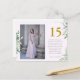 Esta elegante tarjeta de agradecimiento de quinceañera presenta una parte frontal con una foto y el número 15 en tipo dorado, incluye un dulce mensaje de agradecimiento editable y hojas de vegetación en acuarela sobre un fondo rosa pálido. La parte trasera presenta una segunda foto y la dirección de retorno. Esta tarjeta de agradecimiento de cumpleaños número 15 es editable para diversas ocasiones, o para actualizar a tu propio mensaje personal de agradecimiento.