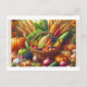 Una vida aún vívida de colores vivos muestra una cosecha abundante con una canasta de mimbre llena de verduras y frutas en su centro. Alrededor de la canasta, una variedad de productos, incluyendo calabazas, orejas de maíz, uvas y ajo, se arreglan artísticamente en un contexto de chapas doradas de trigo y hojas de otoño.