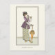 Postal con el ilustracion francés de moda de 1912, Robe de Campagne. Mujer apoyada en una sombrilla vestida con una chaqueta plisada de color púrpura y falda de flores. Imagen alterada y mejorada digitalmente del Journal des Dames.