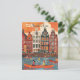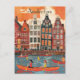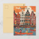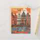 Esta postal de viaje muestra un ilustracion sereno y cálido que representa los canales y el paisaje de Ámsterdam. Es una postal ideal para los viajeros que deseen visitar Ámsterdam o para aquellos que viajan por Ámsterdam y envían una postal a sus familiares o amigos.