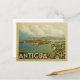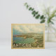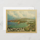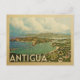 Diseño de Antigua al estilo Viaje de Vintage que presenta una escena de isla tropical con cielo azul y océano.