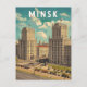 Diseño de viaje vectorial retro de Minsk. Minsk, la capital de Bielorrusia, combina la arquitectura de la era soviética, la vida vibrante de la ciudad y el rico patrimonio cultural.