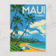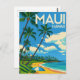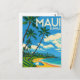 Aloha del paraíso con esta impresionante postal de viaje Maui Hawaii! Este atractivo diseño ilustrado presenta una idílica escena de la playa de Maui con palmeras balanceadas, arena dorada y aguas turquesas cristalinas. El estilizado arte cautiva la serenidad y el ambiente acogedor de esta amada isla hawaiana, llena de complejos turísticos lejanos y alegres bañistas.