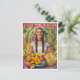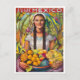 Afiche de viaje vintage de una mujer mexicana de principios del siglo XX, con arcos con cestas de fruta rodeadas de hojas de plátano de nuestra colección de frutas