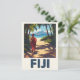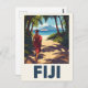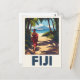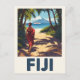 Este afiche de viajes al estilo vintage captura bellamente la idílica belleza de Fiyi. El diseño está decorado con un atuendo tradicional que conduce a una magnífica playa por un sendero de arena bordeado de exuberantes palmeras. A lo lejos, un crucero navega en el agua turquesa, con una isla volcánica en el horizonte. El estilo artístico, con sus formas simplificadas y sus colores vivos, evoca el ambiente clásico y nostálgico de la publicidad de viajes de mediados de siglo.
