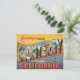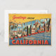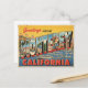 Este es un clásico diseño de postales de estilo vintage con la frase "Saludos desde Monterrey, California". Las grandes y estilizadas letras de MONTEREY contienen cada una una de las escenas únicas de la ciudad, incluyendo su pintoresco puerto, edificios frente al mar y palmeras. El diseño tiene un estilo nostálgico, a mediados de siglo, con su paleta de colores retro y su fuente audaz, lo que lo hace perfecto para productos como postales, posters y camisetas para todo aquel que ame el arte de viajes vintage o la hermosa ciudad costera de Monterey.