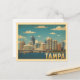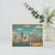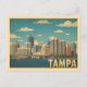 Una impresionante postal de estilo vintage que muestra el moderno perfil de Tampa elevándose sobre el agua. La imagen muestra los edificios del centro de la ciudad y un puente, todos situados bajo un cielo azul brillante con nubes estilizadas. Los colores clásicos y anticuados y el filtro retro le dan a esta imagen un auténtico estilo de poster de viaje vintage, evocando el encanto del estado del Sunshine. Esta tarjeta es perfecta para enviar un mensaje reflexivo, conmemorar un viaje a la costa de Florida, o enmarcar como una pequeña pieza de arte urbano. Un gran diseño para todo aquel que ame Florida, la Costa del Golfo, o los clásicos diseños de paisajes urbanos.