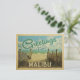 El diseño de esta postal antigua de Greetings From Malibu incluye una playa de arena con un hermoso agua turquesa del océano y sobre el mar, un cielo azul con nubes blancas onduladas. En estilo de viajes vintage.