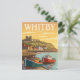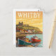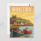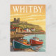 Este afiche de estilo vintage refleja el encanto por excelencia de Whitby, un histórico pueblo pesquero en la costa de Yorkshire del Norte. En el puerto, con marea baja, atracan barcos de pesca de colores, con la playa de arena y las pintorescas casitas de campo a lo largo de la orilla. Encaramado en lo alto del acantilado se encuentra la icónica ruina de la abadía Whitby, un famoso monumento. Los cálidos tonos dorados del cielo y el estilo de arte retro evocan un sentimiento nostálgico, lo que convierte a este lugar en la pieza perfecta para todo aquel que ame las ciudades costeras británicas, la cultura de la pesca o el arte de viajes clásico.