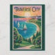 Diseño de viaje vectorial retro de la ciudad de travesía. Traverse City, Michigan, es un encantador destino junto al lago conocido como la Capital Mundial de las Cerezas, que ofrece a los visitantes viñedos, playas de arena del lago Michigan y paisajes pintorescos.