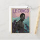 Afiche de viaje de estilo antiguo de la aviación bellamente ilustrado con un hombre de fondo de jungla. Los colores son violeta clara, azul acuático y hojas de palmera oscuras.