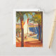 Anuncios especiales de viajes europeos de vintage - Playa, pueblo, gente, palmeras, mar azul y ilustracion del cielo