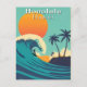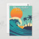 Una colorida postal de estilo vintage de Honolulu, Hawaii, que muestra a un surfista montando una ola con palmeras y una puesta de sol radiante. Un diseño de viajes retro perfecto para coleccionistas y amantes del océano.