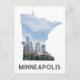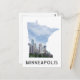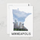 ¡A cualquiera le encantaría recibir esta postal de viaje con el perfil de la ciudad de Minneapolis, Minnesota, en un mapa del estado de Minnesota!
