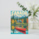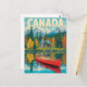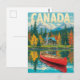 Captura la belleza de Canadá con esta tarjeta postal de viaje de estilo vintage que presenta una cabaña acogedora junto al lago, un bosque de otoño colorido, las montañas Rocosas con nieve en las cimas y una canoa roja clásica reflejada en el agua.