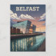 Este afiche de viajes de estilo vintage captura la llamativa arquitectura del museo Titanic Belfast en el crepúsculo. La llamativa y angular fachada del museo se refleja maravillosamente en las aguas quietas del puerto, con una línea de luces que iluminan el paseo marítimo. El cielo es una mezcla de azul profundo y nubes cálidas y brillantes, y montañas lejanas completan la serena escena nocturna. El estilo de arte retro hace de esta pieza perfecta para todo aquel que ame el Belfast, la arquitectura moderna o el arte de viaje vintage.