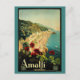 Afiche de viaje europeo de ilustracion vintage o etiqueta de equipaje de la costa de Amalfi en Italia con el hermoso mar Mediterráneo azul, los famosos acantilados empinados de Amalfi y algunas flores de geranio rojo en primer plano. El texto dice Amalfi Italia.