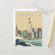 Este llamativo diseño presenta la emblemática estatua de la libertad, situada frente al famoso perfil de Manhattan, todo ello en un sofisticado estilo poster de viajes vintage. Los colores fríos y los elementos gráficos estilizados le dan a la tarjeta un toque Art Deco o Retro distinto.
