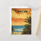 Diseño de postales para viajes en Cancún. Cancún es una popular ciudad costera mexicana en la península de Yucatán, conocida por sus prístinas playas, aguas turquesas y vibrante vida nocturna. Famoso por sus lujosos complejos, sus antiguas ruinas mayas y el buceo con tubo en el Gran Arrecife Mesoamericano, es un destino de primera para los amantes de la playa y la aventura.
