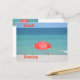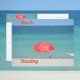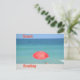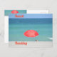 Paraguas de playa rojo brillante contra un hermoso océano tropical azul con el toque de alguien leyendo en la playa. El texto personalizable de esta postal se puede usar para nombrar Su playa. Arena, mar, surf, sol y un buen libro. Esta imagen es la fotografía original de la playa de JLW_PHOTOGRAPHY.