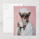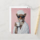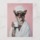 Un leopardo de diseño disfruta de una mañana acogedora, envuelto en una bata blanca con una toalla en la cabeza, tomando café mientras lleva gafas de sol sobre un fondo rosado de moda.