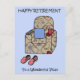 Un cómodo sillón con motivos chinos y un par de zapatillas delante, acompañado de las palabras "Feliz Jubilación a un Maravilloso Vicario".