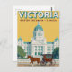 A charming vintage-style travel poster for Victoria, British Columbia, Canada. This artwork showcases the grand Parliament Building and a traditional horse-drawn carriage—iconic symbols of the city. The bold, yellow and teal palette gives the design a bright, retro feel. It's the perfect postcard for travel lovers, fans of Canadian scenery and history, or anyone collecting classic architecture and Art Deco-inspired designs.